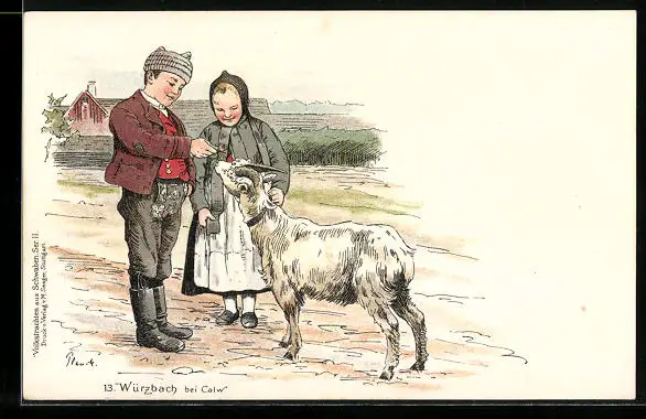 Lithographie Würzbach bei Calw, Kinder in Trachten füttern eine Ziege