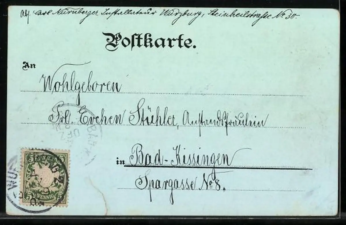 Personenbezogene Daten auf der Rückseite der Karte wurden durch blauen Textmarker unkenntlich gemacht. Die blauen Stellen sind auf die Vorderseite durchgeweicht und wirken sich negativ auf das Postkartenfoto aus