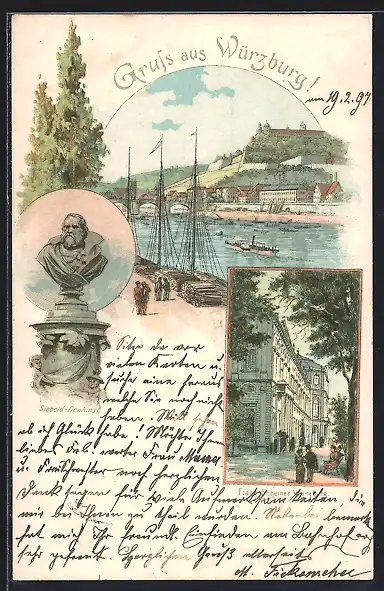 Lithographie Würzburg, Siebald-Denkmal und Uferpartie