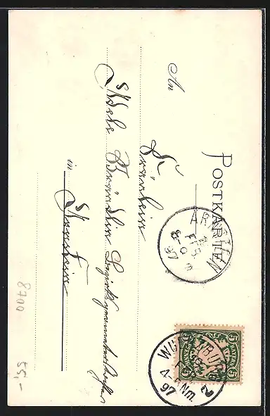 Personenbezogene Daten auf der Rückseite der Karte wurden durch blauen Textmarker unkenntlich gemacht. Die blauen Stellen sind auf die Vorderseite durchgeweicht und wirken sich negativ auf das Postkartenfoto aus