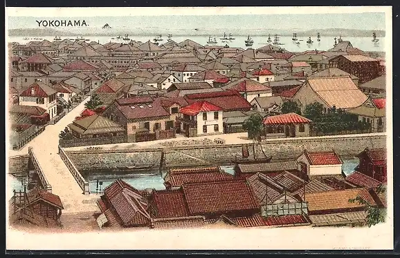 Lithographie Yokohama, Blick über den Ort
