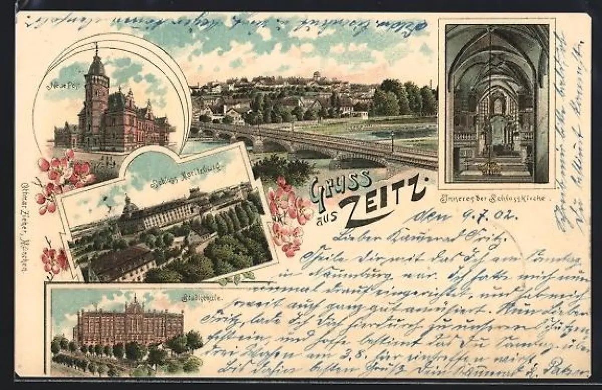 Lithographie Zeitz, Schloss Moritzburg, Stadtschule, Neue Post