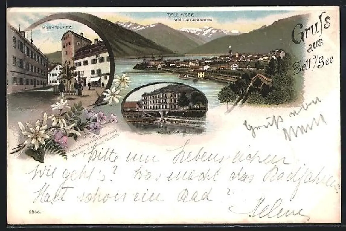 Lithographie Zell a. See, Totalansicht vom Calvarienberg, Marktplatz und Hôtel Krone