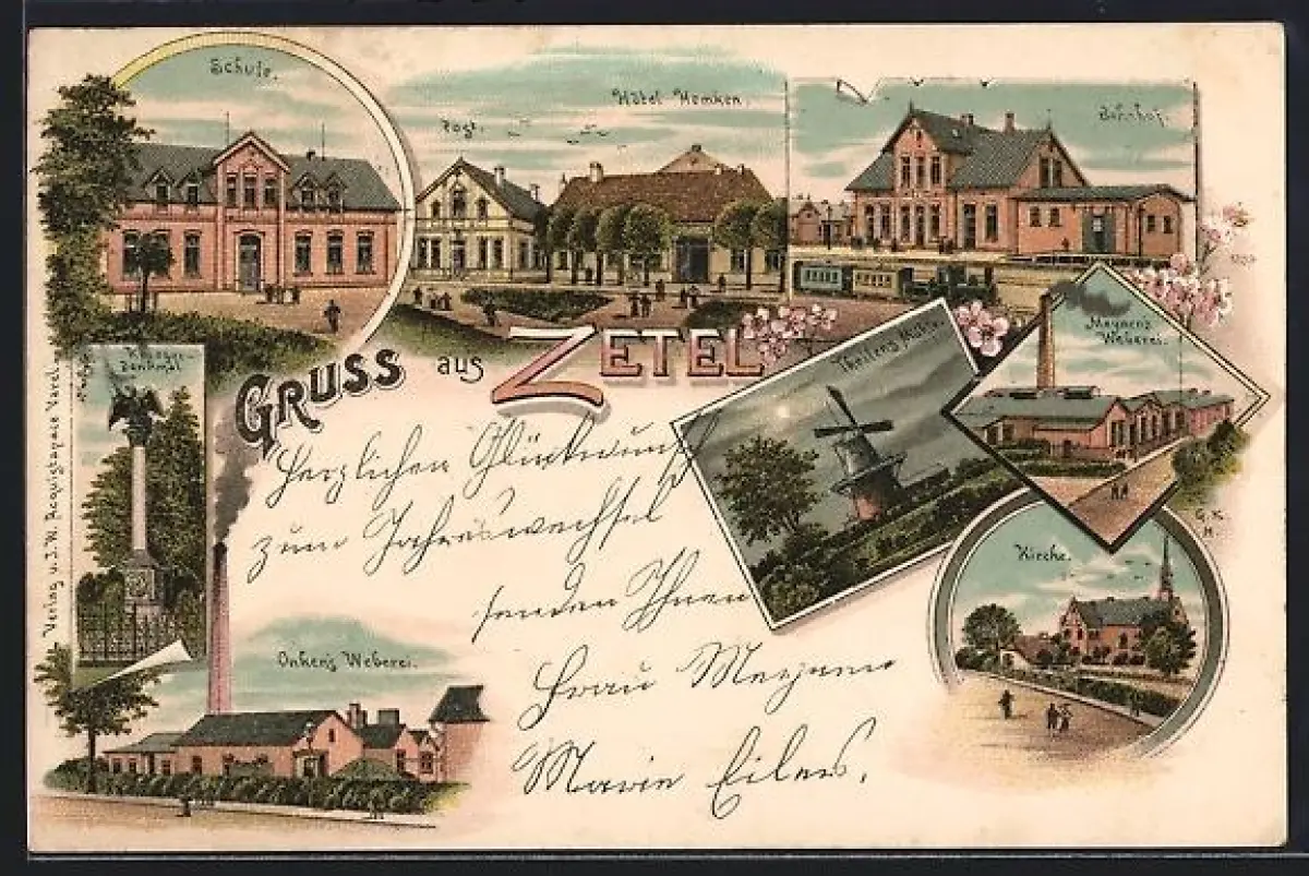 Lithographie Zetel, Hotel Hemken, Bahnhof, Meynen`s Weberei, Onken`s Weberei