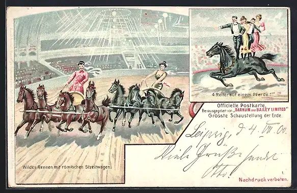 Lithographie Zirkus Barnum and Bailey, 4 Reiter auf einem Pferd, Wildes Rennen mit römischen Streitwagen