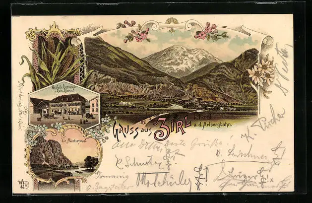 Lithographie Zirl a. d. Arlbergbahn, Totalansicht mit Gasthof Zum Löwen
