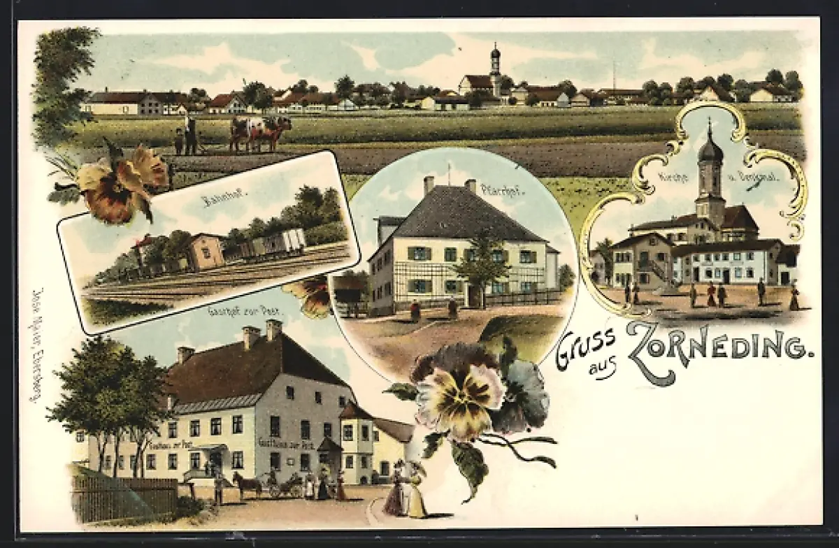 Lithographie Zorneding, Bahnhof, Gasthof zur Post, Pfarrhof, Kirche und Denkmal