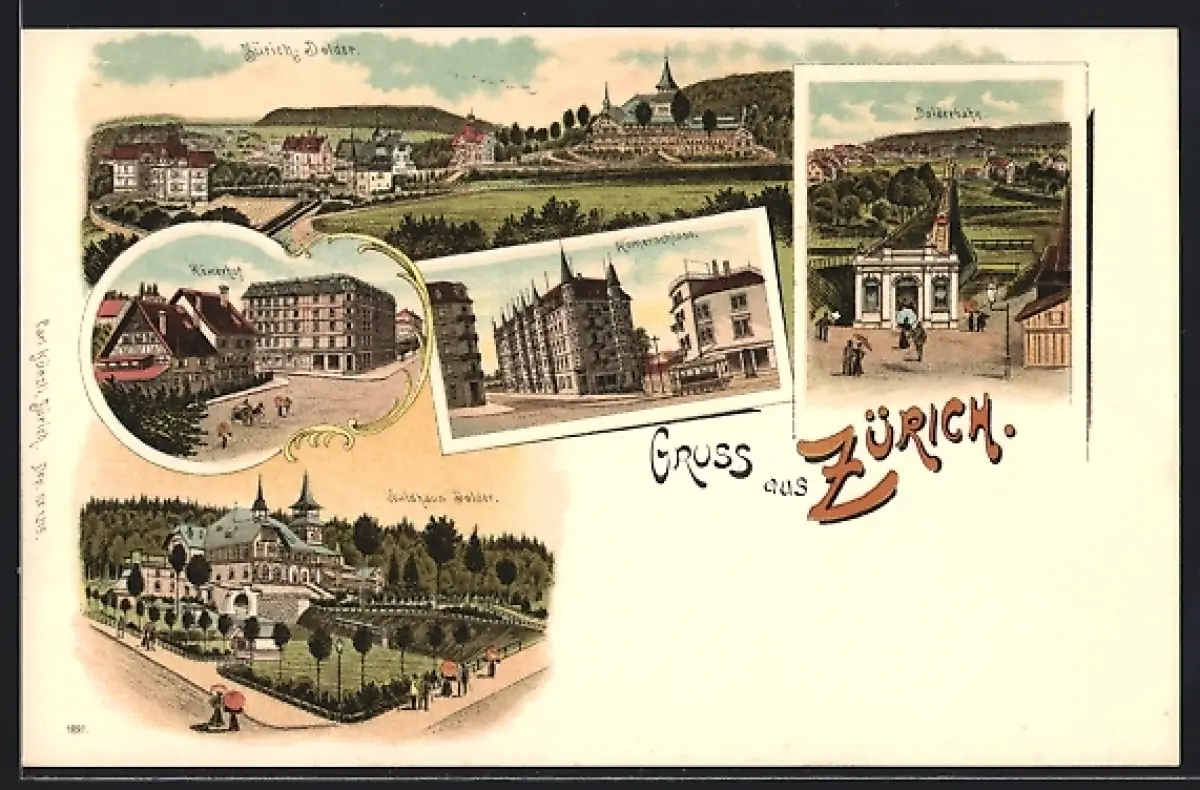 Lithographie Zürich, Dolder, Gaststätte Waldhaus Dolder, Römerhof, Dolderbahn, Ortspanorama