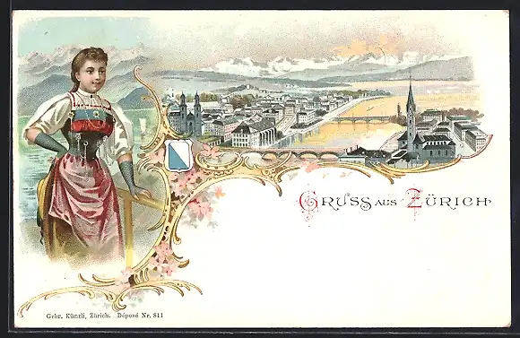 Lithographie Zürich, Frau in Tracht, Wappen Ortsansicht