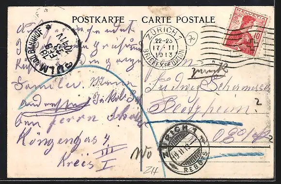 gelaufen 1913, Eckknick oben li., guter Zustand