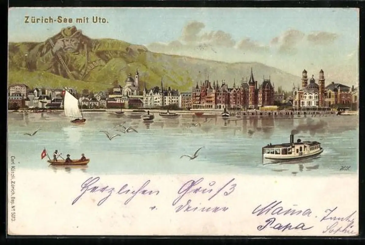 Lithographie Zürich, Ortsansicht, Zürich-See mit Uto, Berggesichter