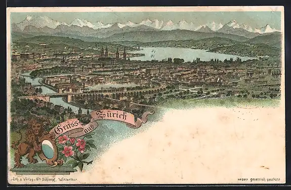 Lithographie Zürich, Panoramablick auf Stadt und Alpen