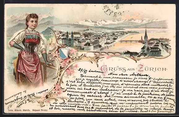 Lithographie Zürich, Teilansicht mit Bergen, Frau in Tracht