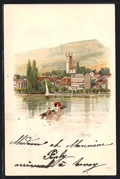 Lithographie Zürich, Teilansicht vom See her, Reklame für Chocolats Lindt & Sprüngli