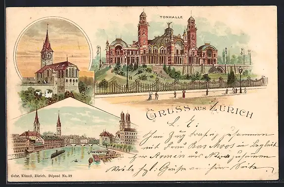 Lithographie Zürich, Tonhalle, Kirche, Teilansicht um 1900