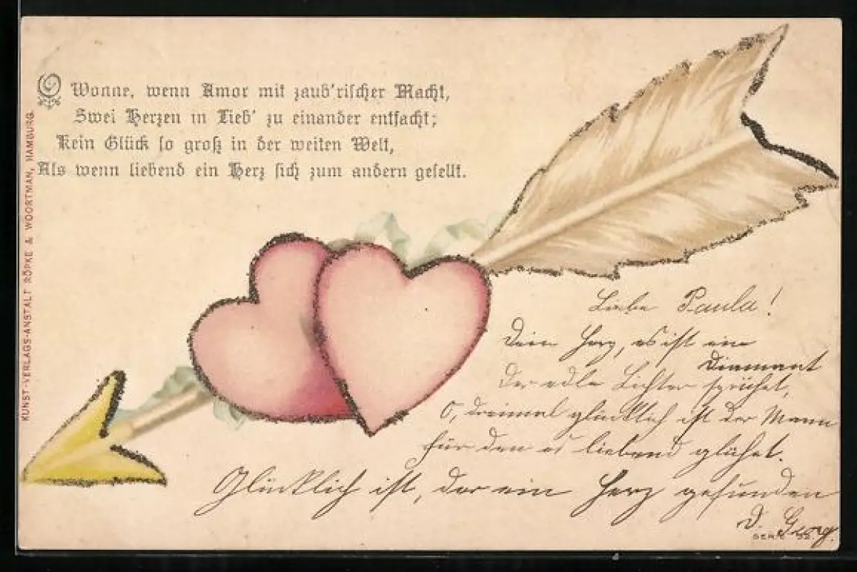 Lithographie Zwei Herzen wurden von Amors Pfeil getroffen, Gedicht