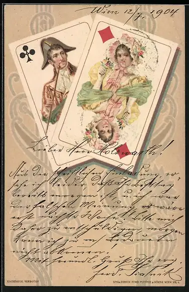 Lithographie Zwei Spielkarten, Kreuz-Bube und Karo-Dame