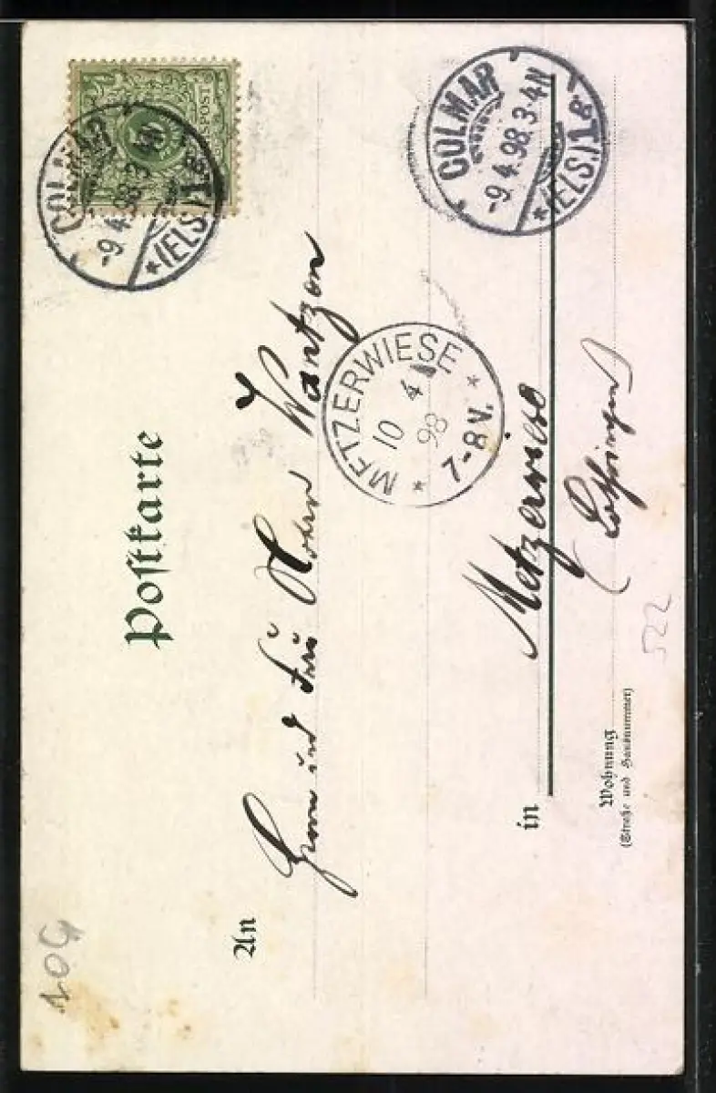 Personenbezogene Daten auf der Rückseite der Karte wurden durch blauen Textmarker unkenntlich gemacht. Die blauen Stellen sind auf die Vorderseite durchgeweicht und wirken sich negativ auf das Postkartenfoto aus