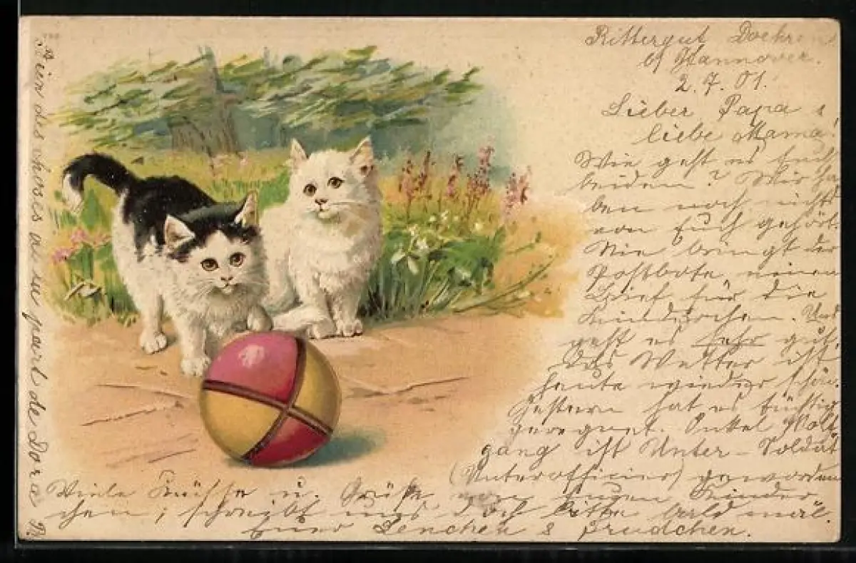 Lithographie Zwei junge Katzen und ein bunter Ball im Grünen