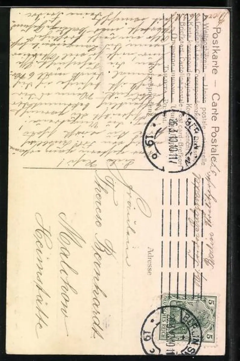 Personenbezogene Daten auf der Rückseite der Karte wurden durch blauen Textmarker unkenntlich gemacht. Die blauen Stellen sind auf die Vorderseite durchgeweicht und wirken sich negativ auf das Postkartenfoto aus