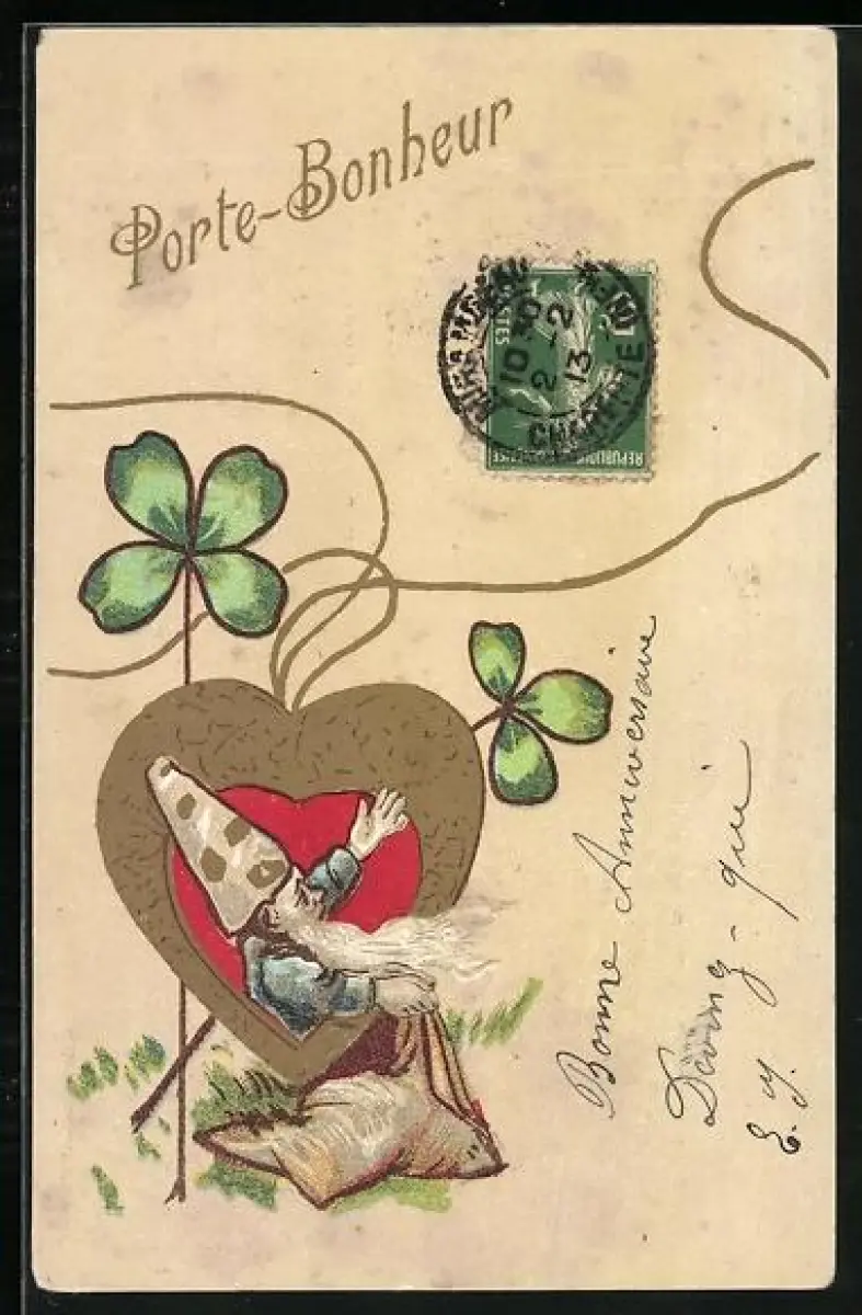 Lithographie Zwerg in einem Herz mit Kleeblättern, Porte-Bonheur