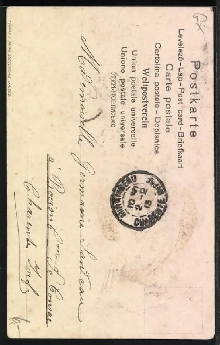 Personenbezogene Daten auf der Rückseite der Karte wurden durch blauen Textmarker unkenntlich gemacht. Die blauen Stellen sind auf die Vorderseite durchgeweicht und wirken sich negativ auf das Postkartenfoto aus