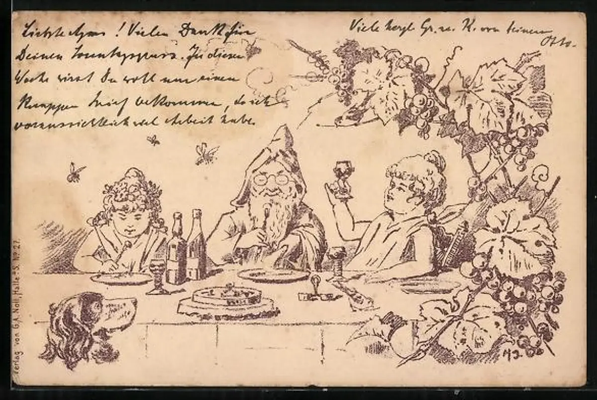 Lithographie Zwerg sitzt mit zwei Kindern und einem Hund an einem Tisch