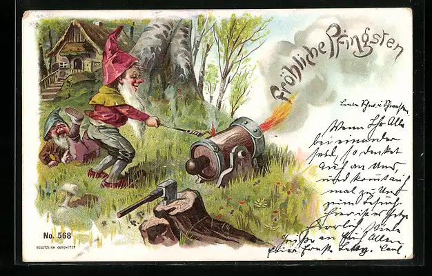 Lithographie Zwerg zündet Kanone an, Zwerg kippt um, Fröhliche Pfingsten