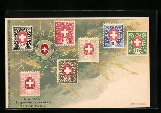 Lithographie die Alten Telegraphenmarken der Schweiz, Gewitter, Blitze