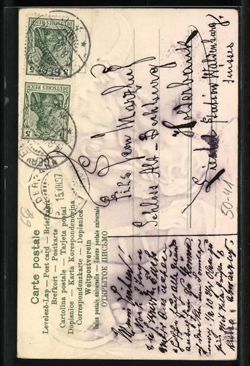 Personenbezogene Daten auf der Rückseite der Karte wurden durch blauen Textmarker unkenntlich gemacht. Die blauen Stellen sind auf die Vorderseite durchgeweicht und wirken sich negativ auf das Postkartenfoto aus