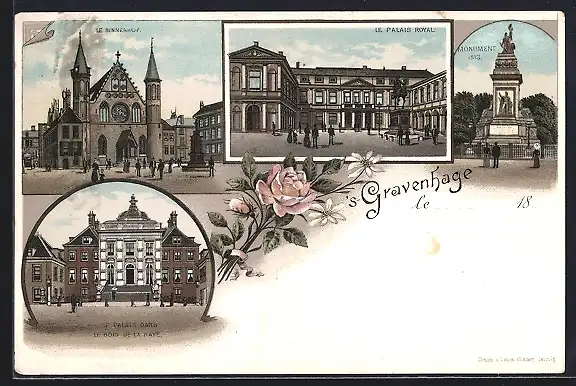 Lithographie `s Gravenhage, Le Binnenhof, Le Palais Royal, Monument 1813