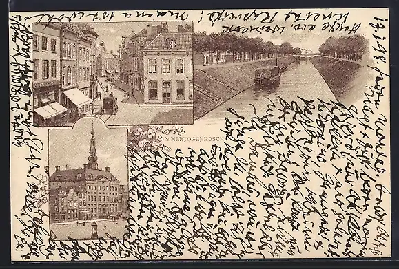 Lithographie `s Hertogenbosch, Rathaus, Strassenpartie, Uferpartie
