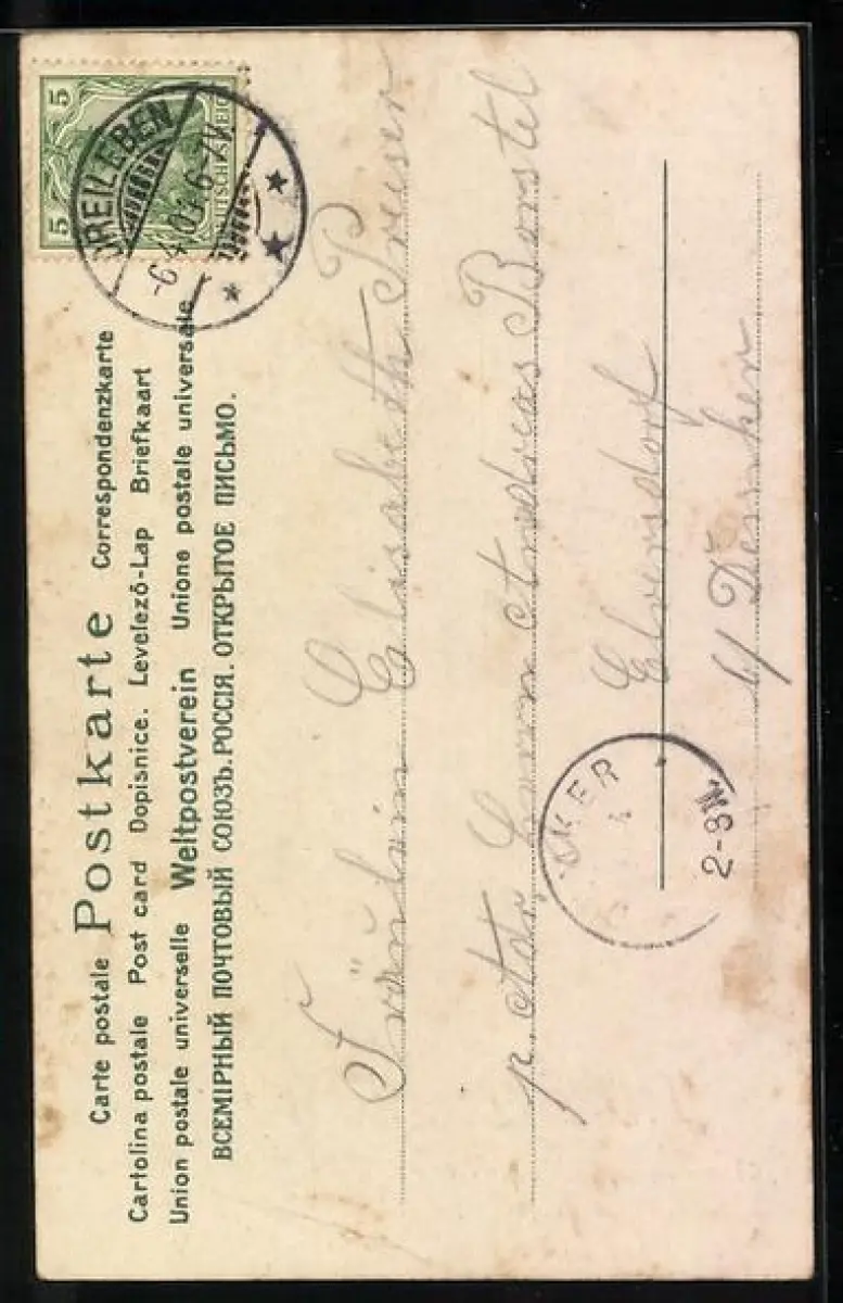 Personenbezogene Daten auf der Rückseite der Karte wurden durch blauen Textmarker unkenntlich gemacht. Die blauen Stellen sind auf die Vorderseite durchgeweicht und wirken sich negativ auf das Postkartenfoto aus