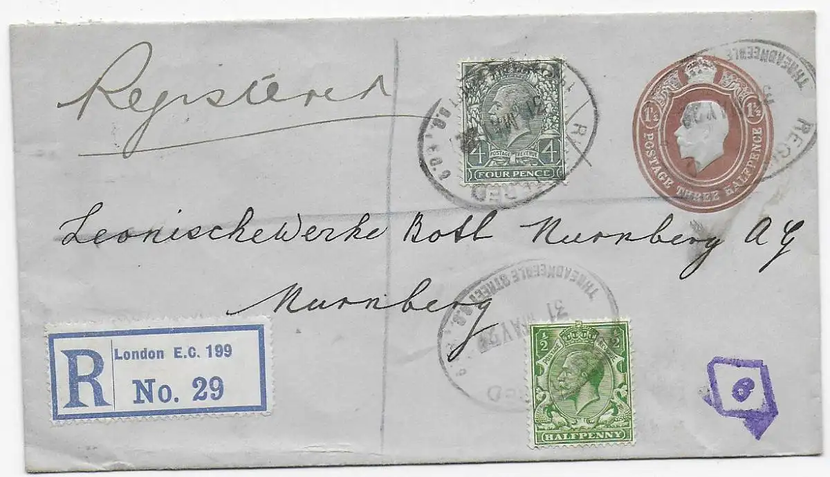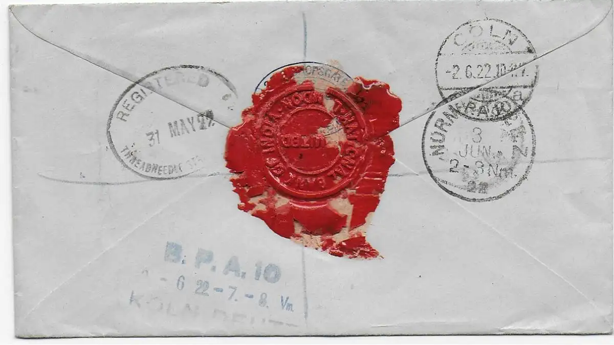 London, Einschreiben nach Nürnberg über Köln, 1922