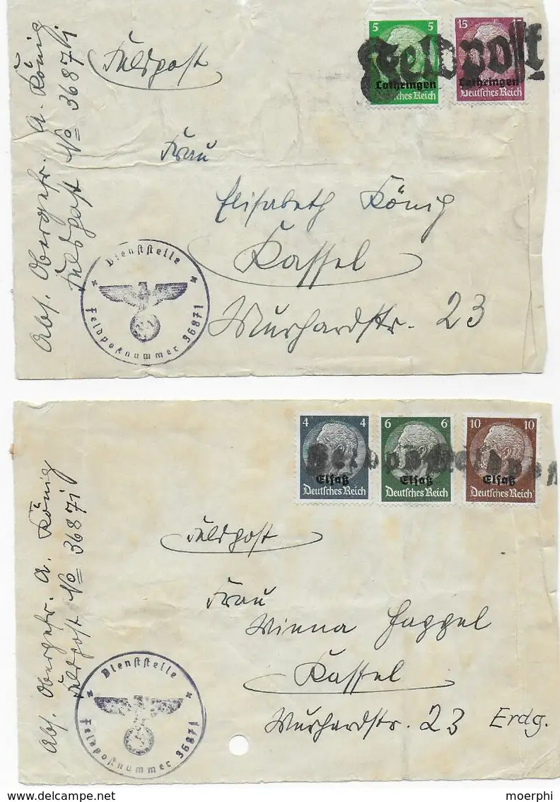 Lothringen/Elsaß: 2x Vorderseite Feldpostpäckchen mit Feldpost Stempel