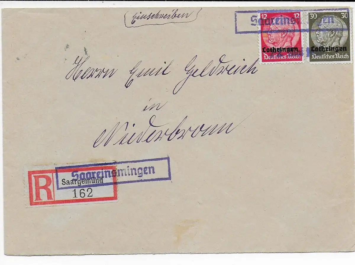 Lothringen: R-Zettel Saaregmünd, überstempelt Saareinsmingen nach Niederbronn
