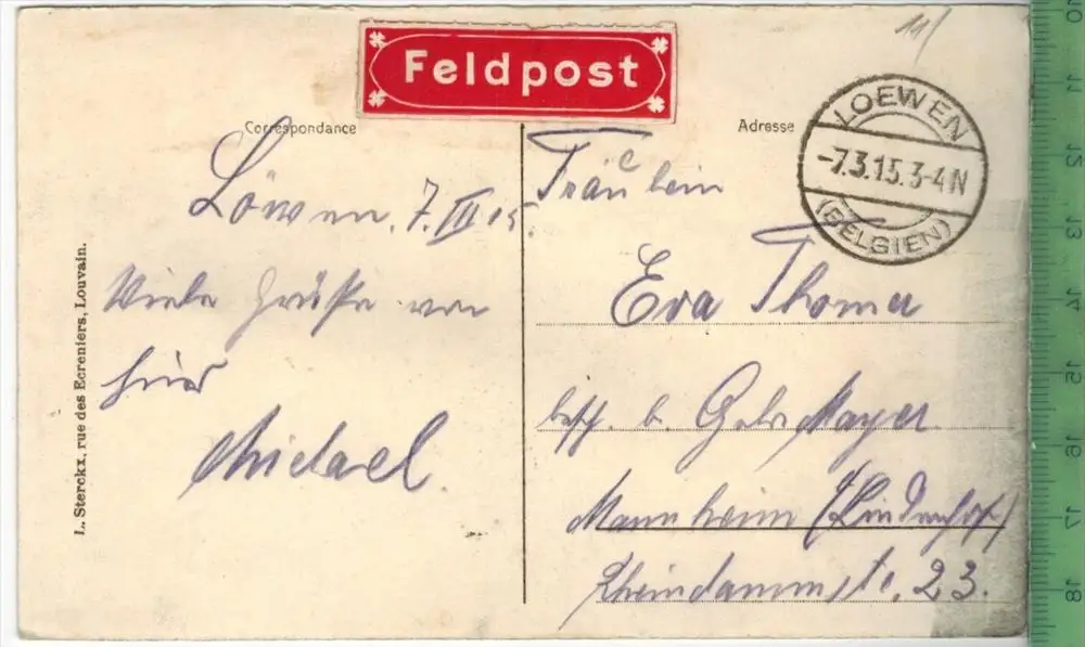 Louvain, Abbaye du mont Cèsar. L`entrèe de l`Abbaye 1915, Verlag: I. Sterckx, Louvain, FELD- Postkarte ohne Frankatur, mit Stempel, LOEWEN 7.3.15, MIT BEFÖRDERUNGSSPUREN, Erhaltung: I-II, Karte wird in Klarsichthülle verschickt. (H)