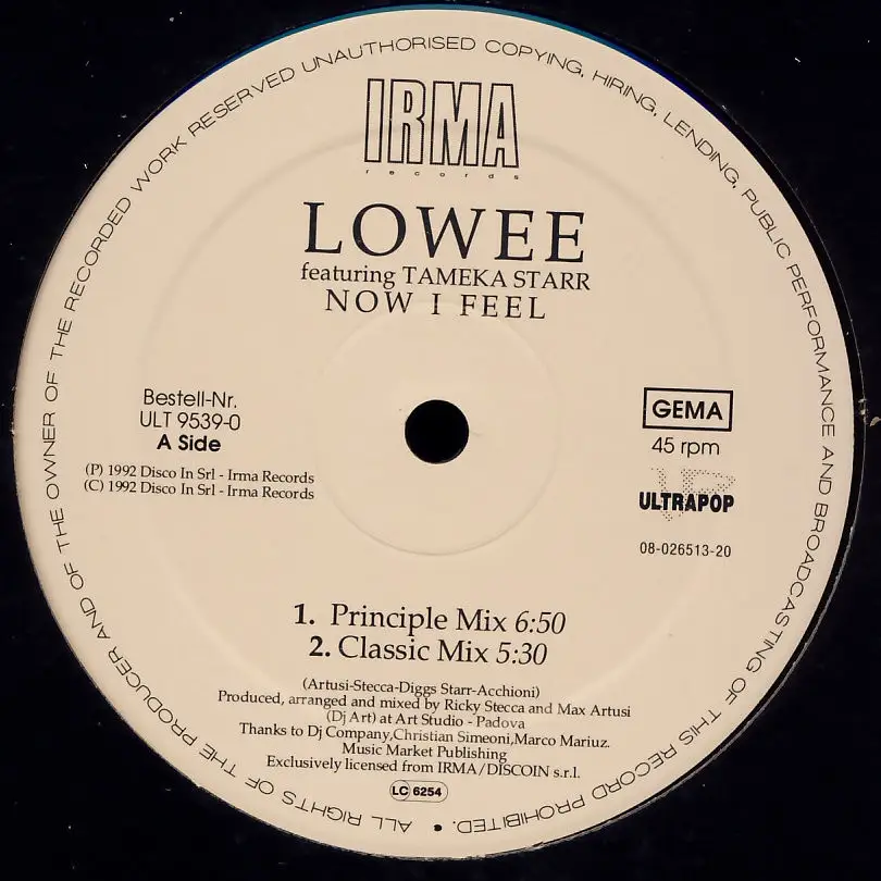 12" Maxi Lowee - Now I Feel, feat. Tameka Starr, neutrales Cover mit Info-Aufkleber, Zustand Platte M- Hülle M-; Made in Germany 1992 Ultrapop ULT 9539-0, Tracks Principle Mix 6:50, Classic Mix 5:30, Ricky Overdrive Mix 5:30