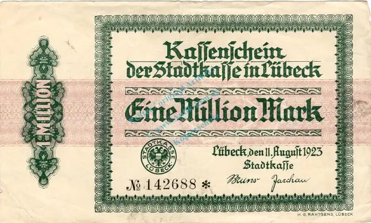 Lübeck , Banknote 1 Million Mark Schein gbr. Keller 3335.c , Schleswig Holstein 1923 Inflation