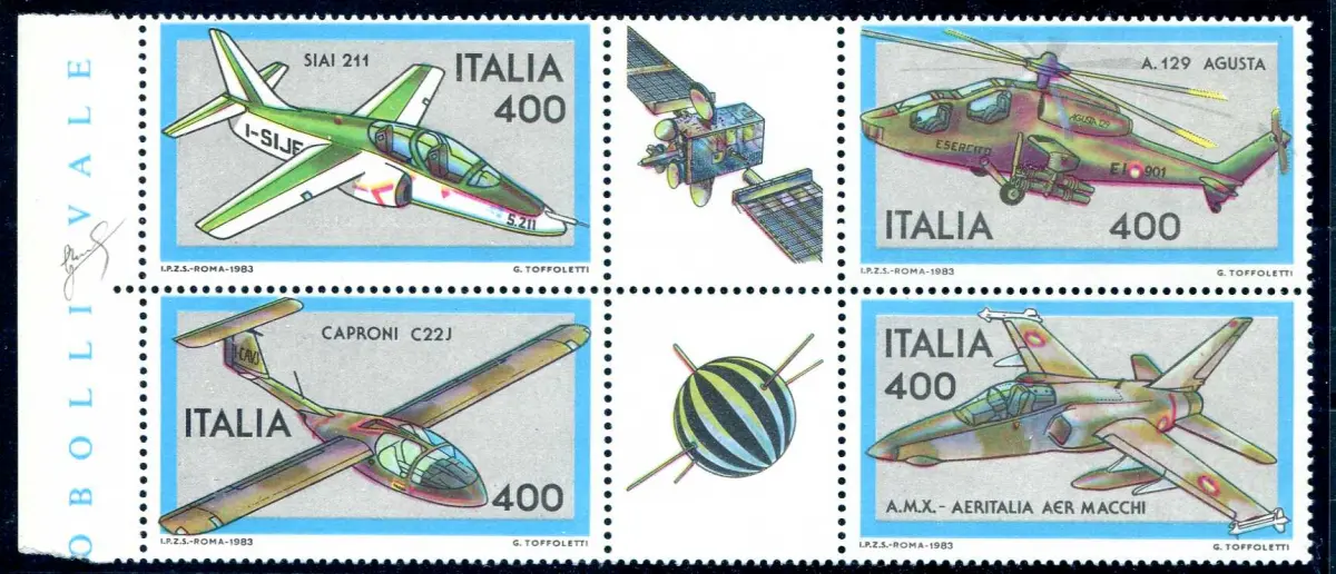 Vollgummi - Luftfahrtkonstruktionen Nr. 1632/1635 die Blockserie mit deutlich schwächerem Rotdruck als normal - Cert. G. Biondi Code 795/3
