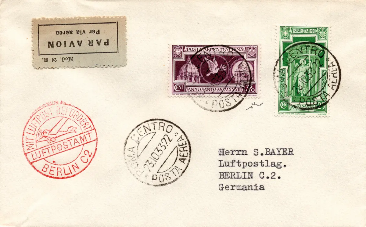 Umschlag - Luftpost Anno Santo Cent. 75 Nr. 55 + komplementäre P.O. Nr. 346 auf Luftumschlag nach Berlin am 23.10.33 - neben Jahrgangsseite rot LUFTPOSTAMT, ohne Ann. bei Ankunft - Sehr schön - Kat. euro 800 Cod. 42/17