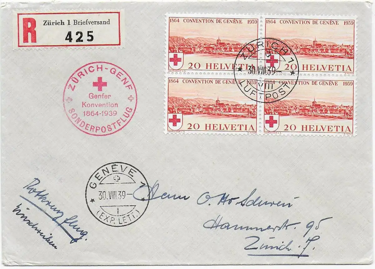 Luftpost Einschreiben Zürich: Zürich-Genf Sonderpostflug: Genfer Konvention 1939