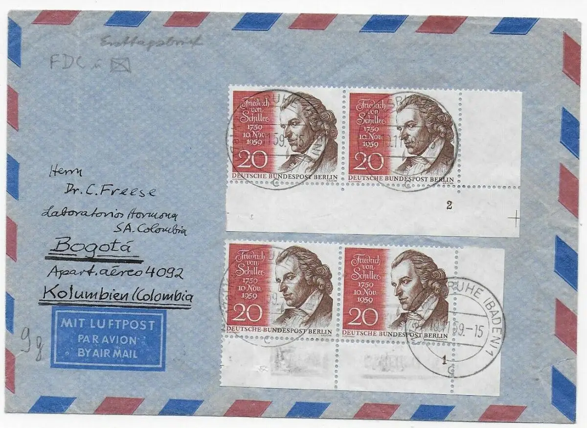 Luftpost Karlsruhe 1959 mit MeF, FDC und den Formnummern 1 und 2, Eckrand