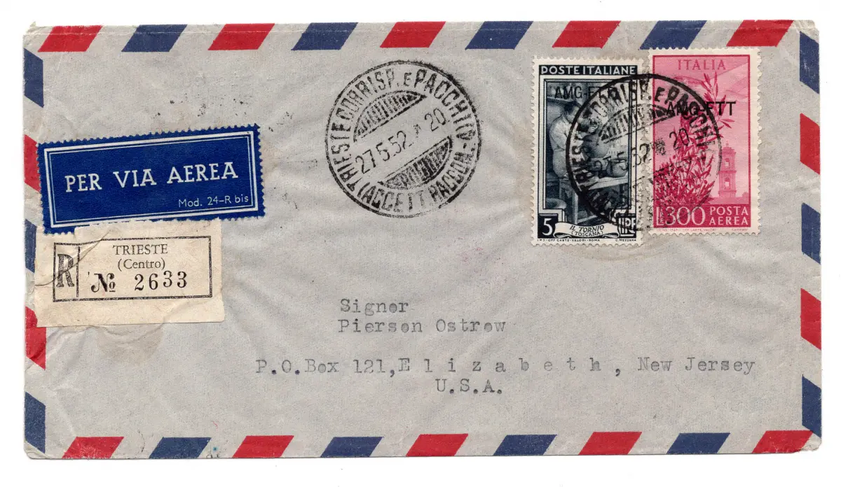 Luftpost Lire 300 Kapitol + Ergänzung auf Umschlag Racc. auf dem Luftweg - Luftpost Lire 300 Kapitol Nr. 24 + Zusatzpost Nr. 92 auf Umschlag Racc. auf dem Luftweg in die USA am 27.5.52 - nicht philatelistische Nutzung im Tarif Nr. 1117/20