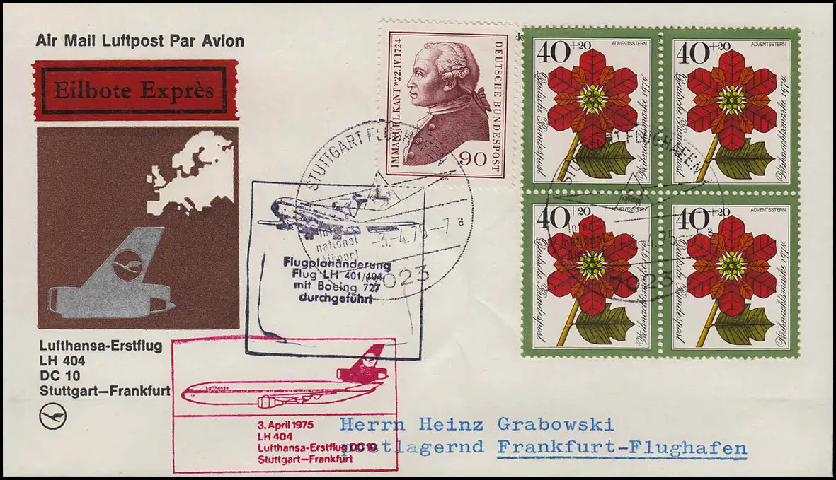Luftpost Lufthansa Eilbote Expres DC 10 LH 404 Stuttgart / Frankfurt 3.4.1975
