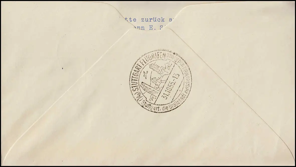 Wiederaufnahme des Flugverkehrs nach Stuttgart 31. Oktober 1955, roter Stempel "Befördert mit Lufthansa nach Stuttgart"