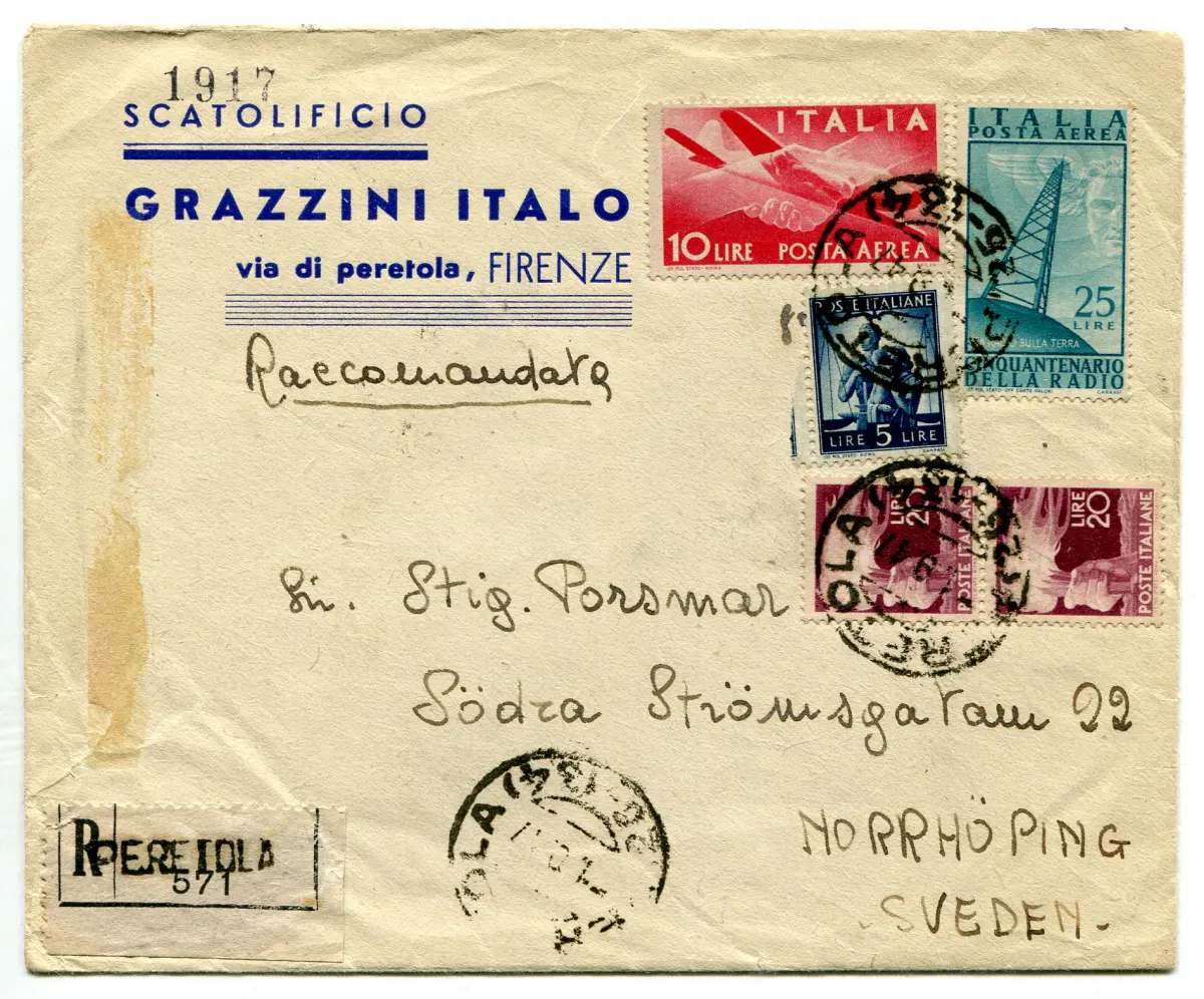 - Luftpost Radio Lire 25 Nr. 139 + Ergänzungen Nr. 130 + P.O. Nr. 555 + 561 Paar auf Umschlag Racc. für Schweden am 1.9.47 - erster Tag Tarifwechsel Nr. 1084/A
