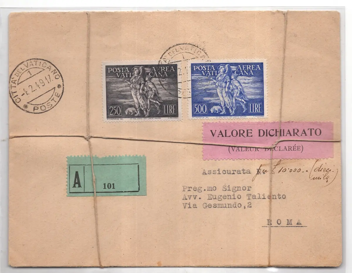 Luftpost Tobia Nr. 16/17 Serie auf versichertem Umschlag nach Rom am 4.2.49 - seitlich zweisprachiges Postetikett Deklarierter Wert - Schnur und Wachsstempel - sehr guter Erhaltungszustand - Selten - Kat. euro 1.6300 Cod. 916/16