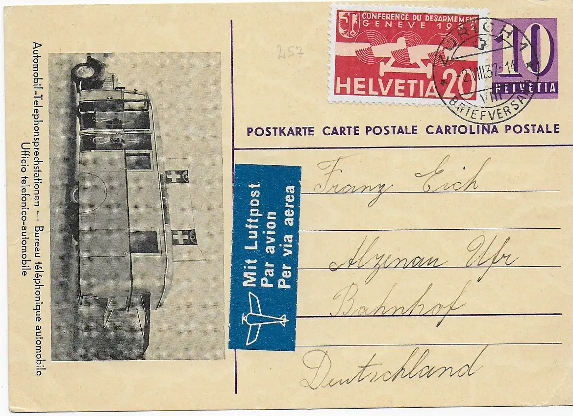 Luftpost Zürich nach Alzenau, 1937, Automobil Telephonsprechstationen
