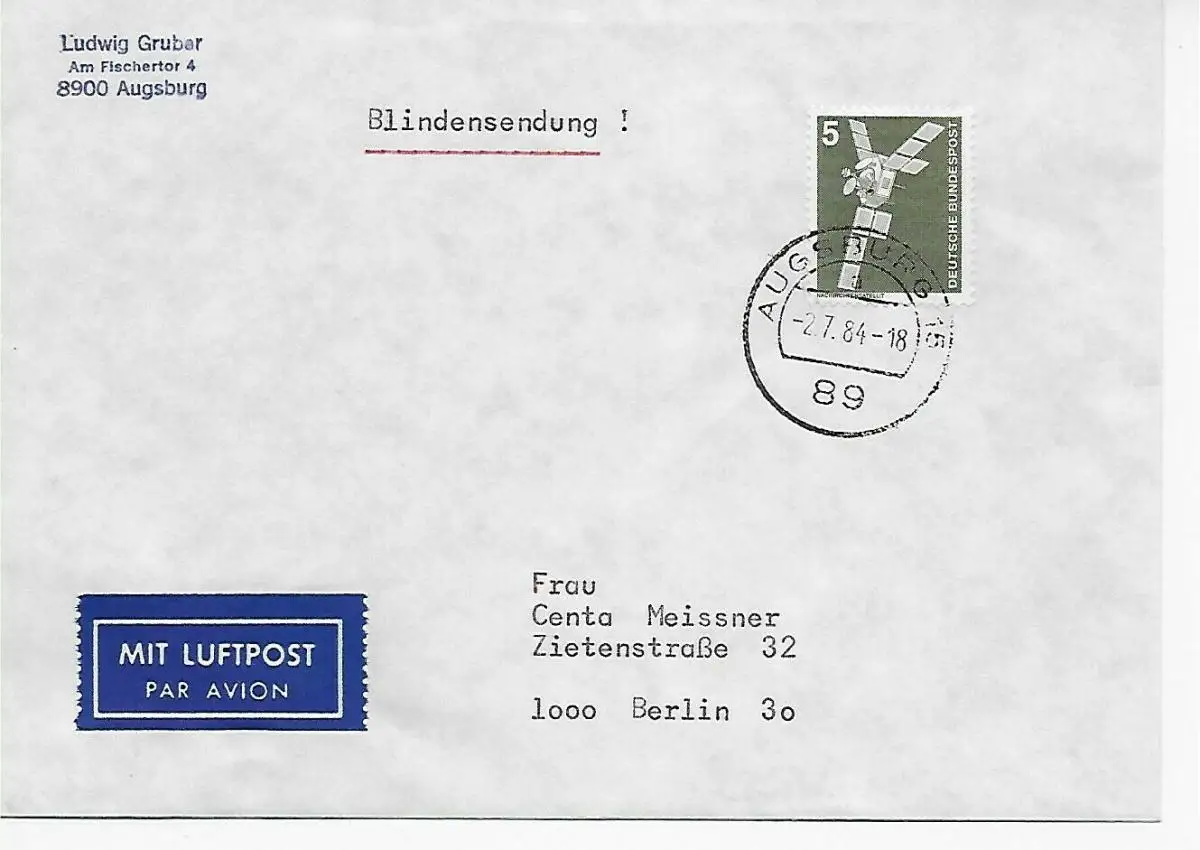 Luftpostbrief: Blindensendung von Augsburg 1984 nach Berlin